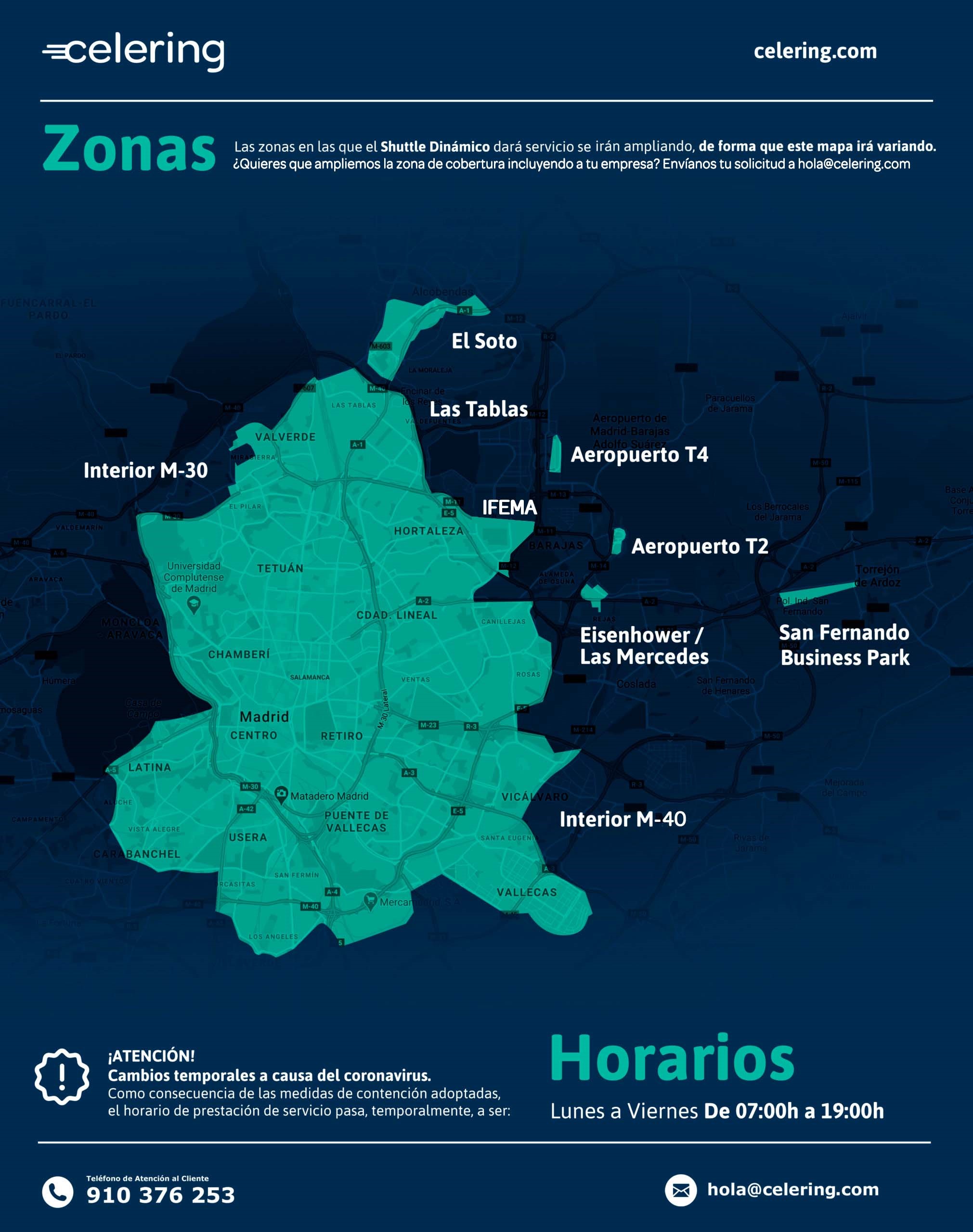 Celering, startup española especializada en ofrecer servicios de movilidad a empresas y particulares, anuncia que las zonas de Madrid en las que su Shuttle Dinámico ofrece servicios van a ser ampliadas próximamente.