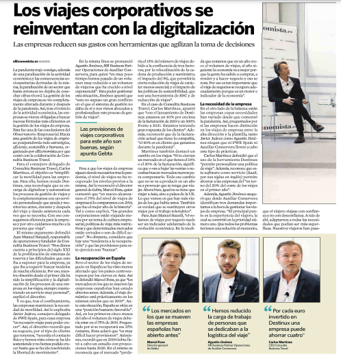 Nuestro cliente Consultia Business Travel participó esta semana en un Observatorio de El economista en el que analizaron cómo la digitalización está contribuyendo a una gestión de los viajes de empresa más estratégica, eficiente, sostenible y humana. Además, de los directivos de Consultia Business Travel, el encuentro contó con la participación del director general de GEBTA, Marcel Fons; el CEO de PWE Spain, Javier Juárez; y el HR Business Partner Operaciones de Auxiliar Conservera, Agustín Jiménez.