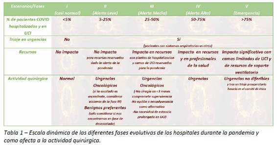Así, la AEC ha desarrollado una escala dinámica (Tabla 1), la cual ha sido validad a nivel nacional e internacional, en la que se contemplan 5 fases de alerta con el objetivo de ordenar las recomendaciones relativas a las cirugías electivas y urgentes en cada una de ellas. Para elaborar esta escala se ha tenido en cuenta el porcentaje de pacientes hospitalizados en planta y en las Unidades de Cuidados intensivos de pacientes COVID19 en relación con el número de camas hospitalarias disponibles y a los recursos del hospital utilizados para atender a los pacientes infectados.