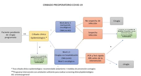 Además se han incorporado check list de cribado epidemiológico y clínico telefónico y urgencias, así como el modelo de formulario de notificiación de indentificación de pacientes sospechosos hospitalizados, consentimiento informativo  o esquemas informativos para este colectivo como el cribado preoperatorio covid19, en el que se informa a los cirujanos de los pasos a seguir ante posibles pacientes con cirugías programas en función de si tienen o no la enfermedad.