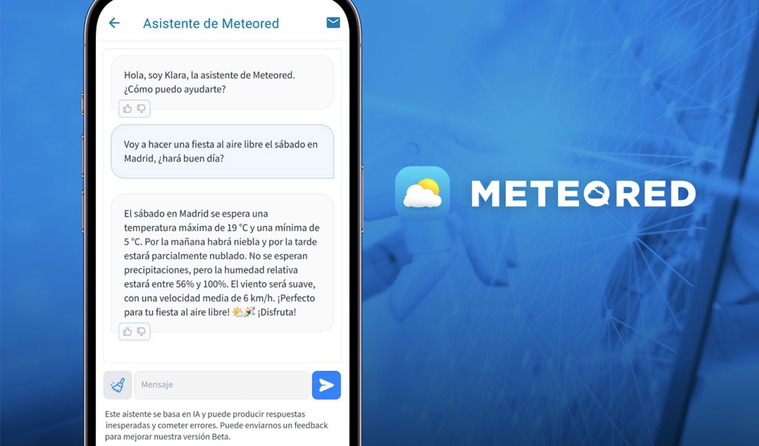 Meteored es uno de los portales líderes en pronóstico e información meteorológica a nivel mundial, una de las apps del tiempo más usadas, con sus pronósticos basados en el modelo de predicción europeo ECMWF, el más avanzado del mundo. El componente tecnológico ha sido siempre uno de sus aspectos diferenciadores, por ello, ahora da un paso más y desarrolla su propio asistente virtual basado en IA con el objetivo de adaptarse a los nuevos hábitos de consumo de información de los usuarios sin perder el rigor científico que nunca debe desligarse de la información meteorológica.