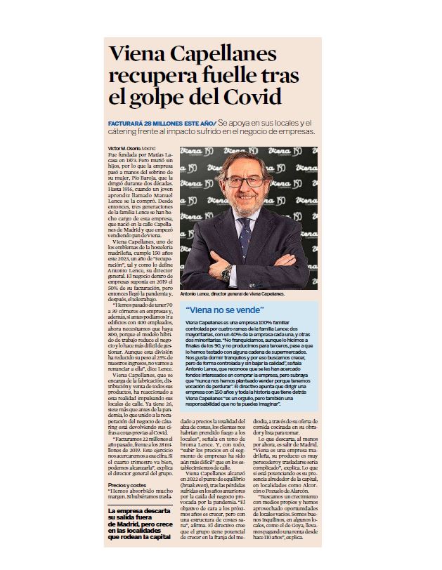 Viena Capellanes, uno de los emblemas de la hostelería madrileña, cumple 150 años este 2023, un año de “recuperación”. Este año, cuenta con 26 locales, siete más que antes de la pandemia, lo que unido a la recuperación del negocio de cátering está devolviendo sus cifras a cotas previas al Covid, tal y como recoge el medio económico Expansión en una entrevista a Antonio Lence, director general de la compañía.